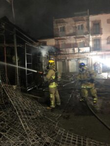 Morelia, Michoacán; 21 de mayo de 2023.- La noche de ayer, puestos de comerciantes ubicados a las afueras del mercado Independencia en la ciudad de Morelia, se vieron afectados por un incendio que avanzó rápidamente y logró dañar la estructura del estacionamiento del inmueble.