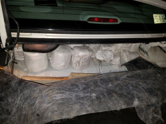 Durante la inspección del automóvil se procedió con la apertura de la cajuela, detectando un fuerte olor, por lo que intensificaron la revisión los Policías Estatales percatándose que la alfombra estaba sobrepuesta, encontrando de tras de ella cinco paquetes blancos envueltos en plástico transparente que contenía una hierba verde y seca con las características de la marihuana.