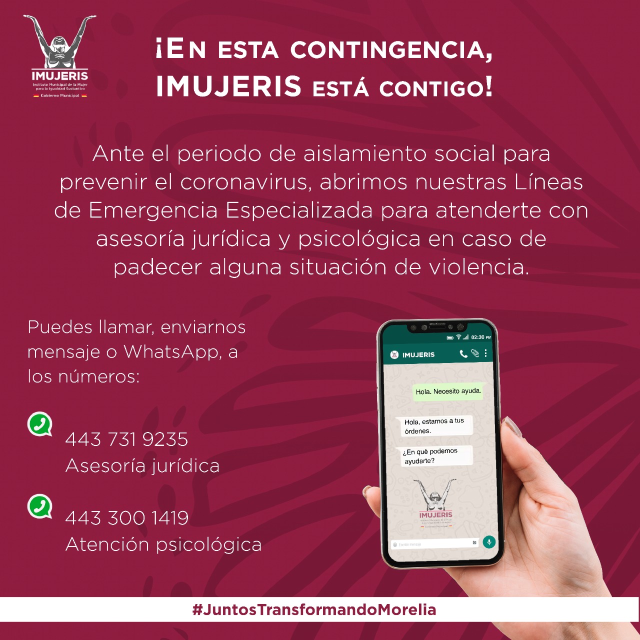 27 de marzo del 2020.- El Instituto Municipal de la Mujer para la Igualdad Sustantiva (IMUJERIS), activa a partir de hoy tres Líneas de Emergencia Especializada, en donde se brindará apoyo en materia jurídica y psicológica a las morelianas, en caso de padecer algún tipo de violencia durante el periodo de aislamiento ante las medidas preventivas por el COVID-19.