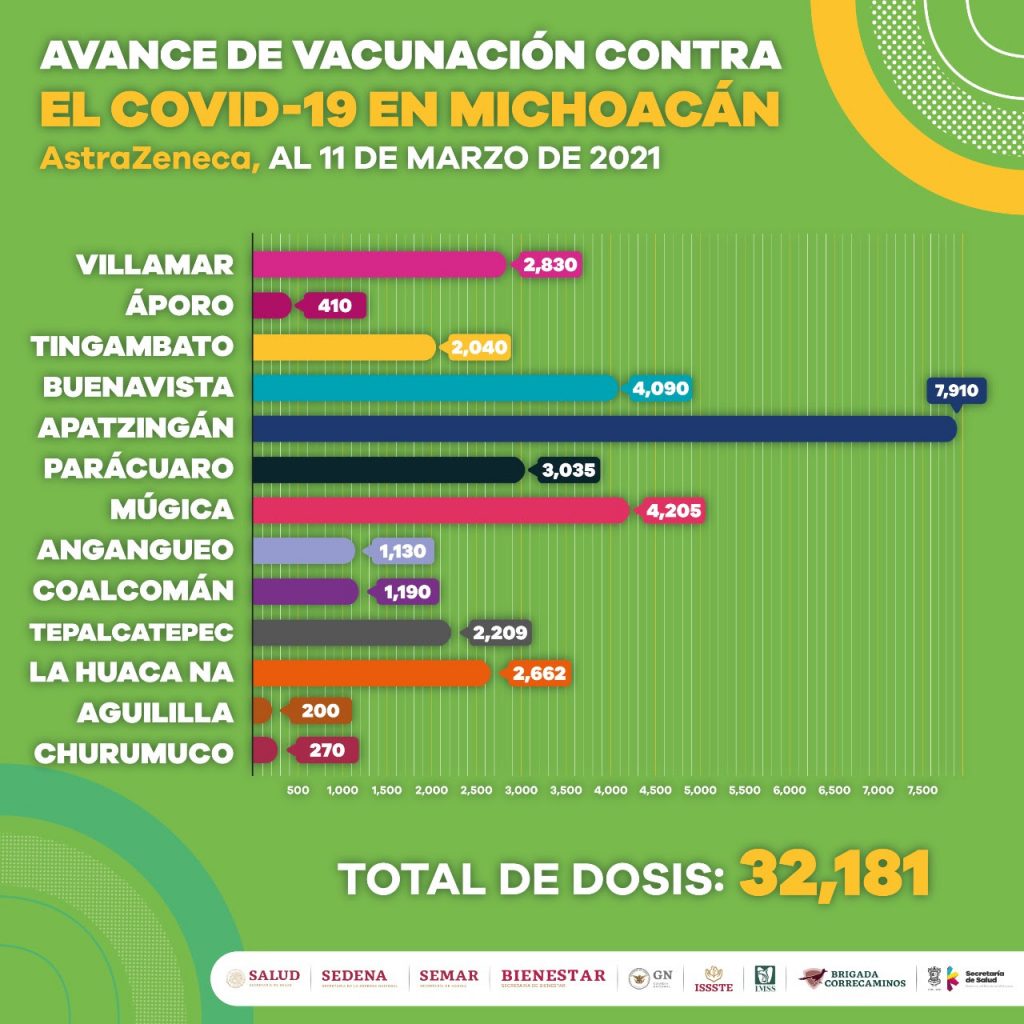 Los municipios con puestos de vacunación activa son: Jacona, Zamora, Hidalgo, Churumuco, Aguililla, Uruapan, Huetamo, y Lázaro Cárdenas; mientras que, en Villamar, La Huacana, Tingambato, Buenavista, Tepalcatepec, Apatzingán, Parácuaro, Múgica, Angangueo, Coalcomán y Áporo, se concluyó con la aplicación de dosis designadas.