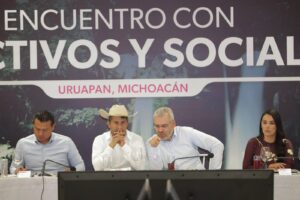 Uruapan, Michoacán, 26 de noviembre de 2024.- El gobernador Alfredo Ramírez Bedolla y representantes de las cámaras de industria, comercio y servicios, así como productores de Uruapan, acordaron reforzar acciones de desarrollo y preservación de la paz en la región.