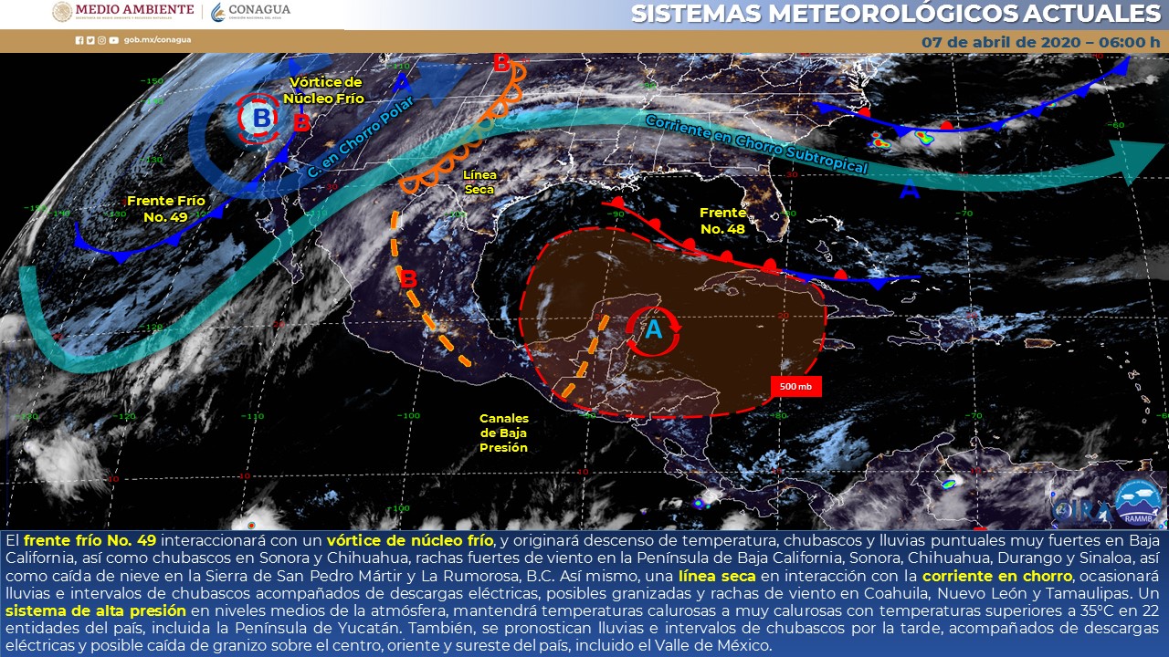 El frente frío número 49 se extenderá sobre el norte de Baja California, continuará interaccionando con un vórtice de núcleo frío localizado en el suroeste de Estados Unidos. Esto provocará un descenso de temperaturas, chubascos y lluvias fuertes en Baja California, Sonora y Chihuahua.