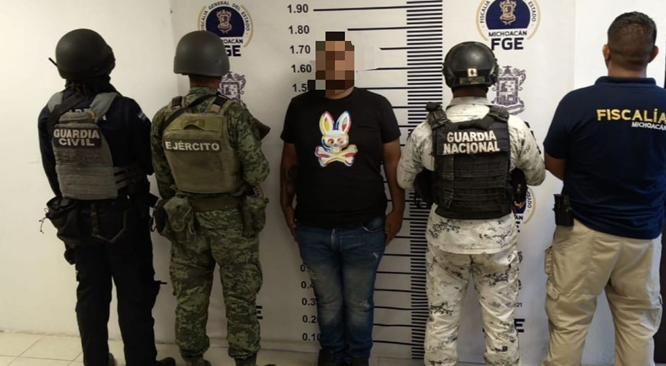Buenavista, Michoacán, 23 de mayo de 2024.- Derivado del despliegue operativo en la región de Tierra Caliente, elementos de las secretarías de Seguridad Pública (SSP) y de la Defensa Nacional (Sedena), así como de la Guardia Nacional (GN) y Fiscalía General del Estado (FGE), detuvieron a Rogelio N., presuntamente relacionado con la célula delictiva de Los Viagras que opera en la zona; además, se confirmó que cuenta con una orden de aprehensión vigente por el delito de homicidio.