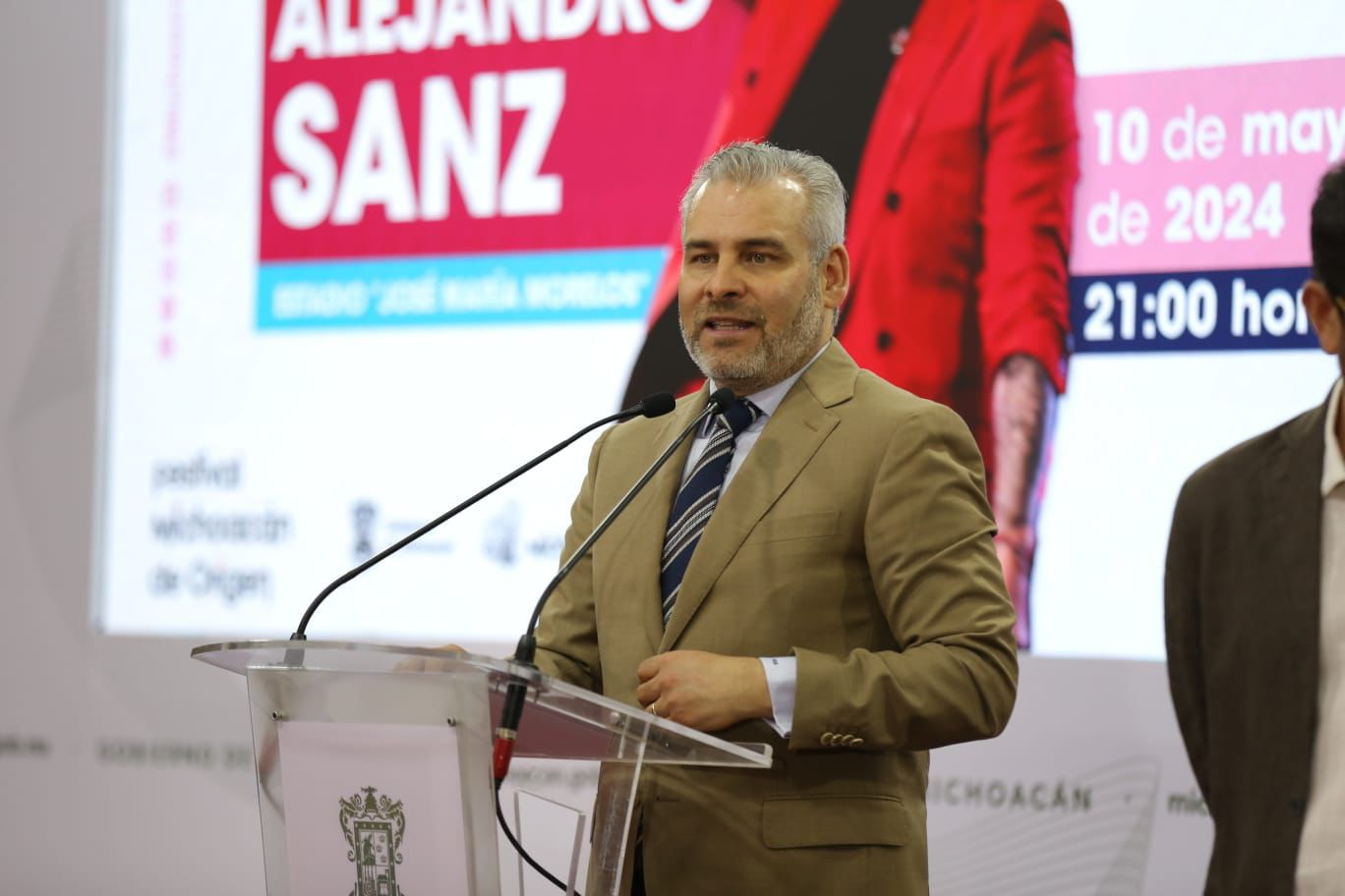 Morelia, Michoacán, 22 de abril de 2024.- Alejandro Sanz es el artista sorpresa que estará de manera gratuita en el Festival Michoacán de Origen (FMO) para cantarle a las mamás el 10 de mayo, así lo dio a conocer el gobernador Alfredo Ramírez Bedolla.