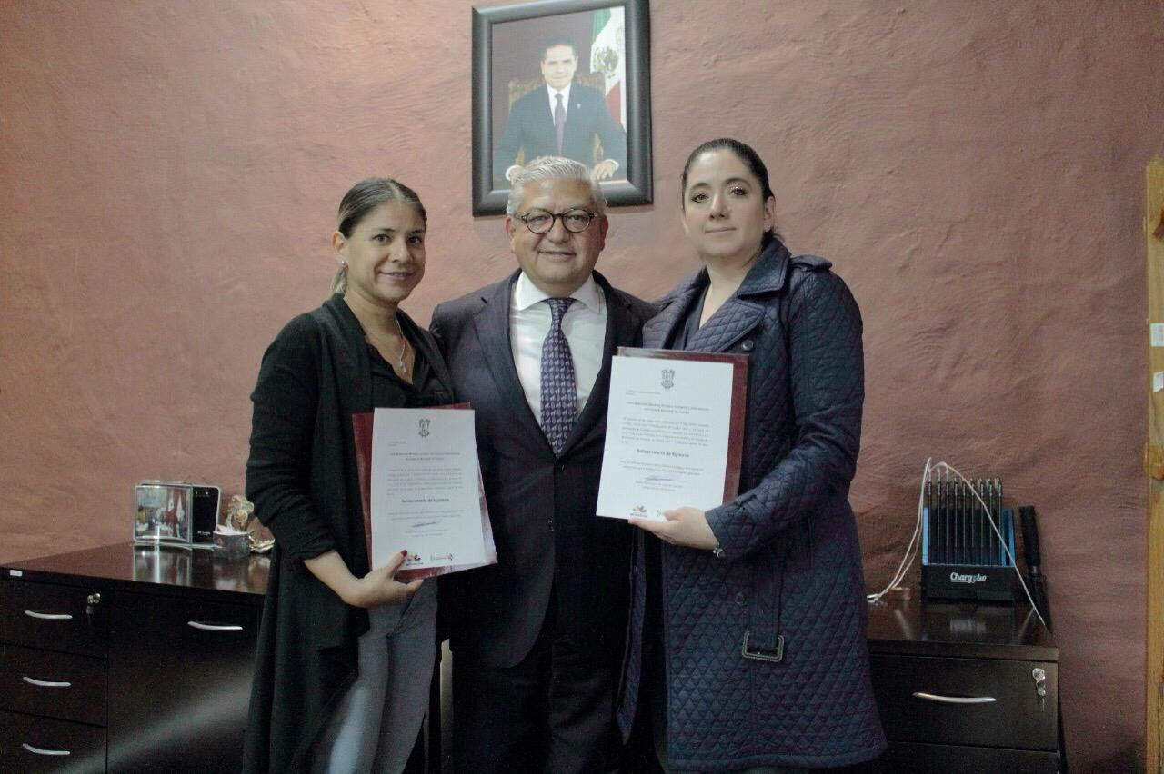 Morelia, Michoacán, a 5 de noviembre de 2019.- El titular de la Secretaría de Finanzas y Administración (SFA) de Michoacán, Carlos Maldonado Mendoza, entregó los nombramientos como subsecretarias de Ingresos y Egresos, a Elia Alejo Acosta y a Elizabeth Tatiana Madrid Marco, respectivamente.