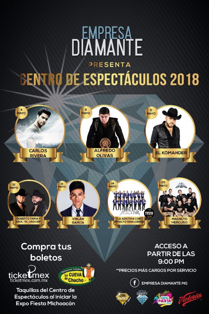 Morerlia, Michoacán a 6 de Abril de 2018.- Con siete fechas disponibles en el Centro de Espectáculos, esta tarde la empresa diamante dio a conocer quiénes serán los artistas que se presentarán para la próxima ExpoFiesta Michoacán.