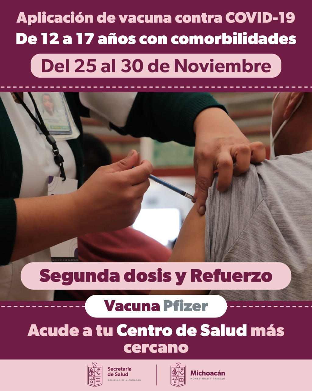 Morelia, Michoacán, 25 de noviembre del 2022.- Todos los adolescentes de entre 12 a 17 años, con alguna comorbilidad, podrán solicitar la segunda dosis o el refuerzo adicional contra el COVID-19, del 25 al 30 de noviembre.