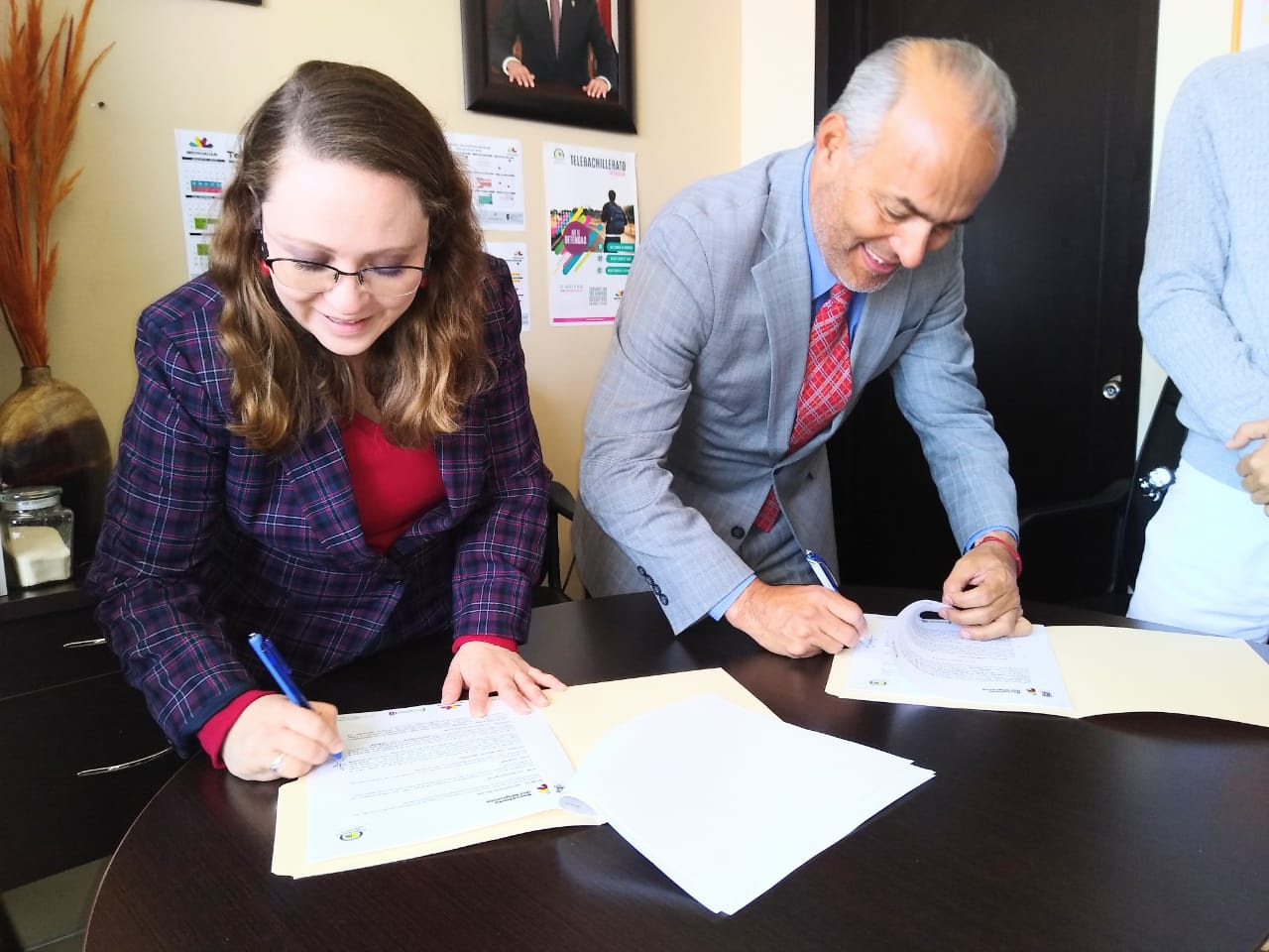 La firma fue encabezada por los titulares de la Semigrante, José Luís Gutiérrez Pérez y la directora de Telebachillerato de Michoacán (TEBAM), Cecilia Lazo de la Vega de Castro.