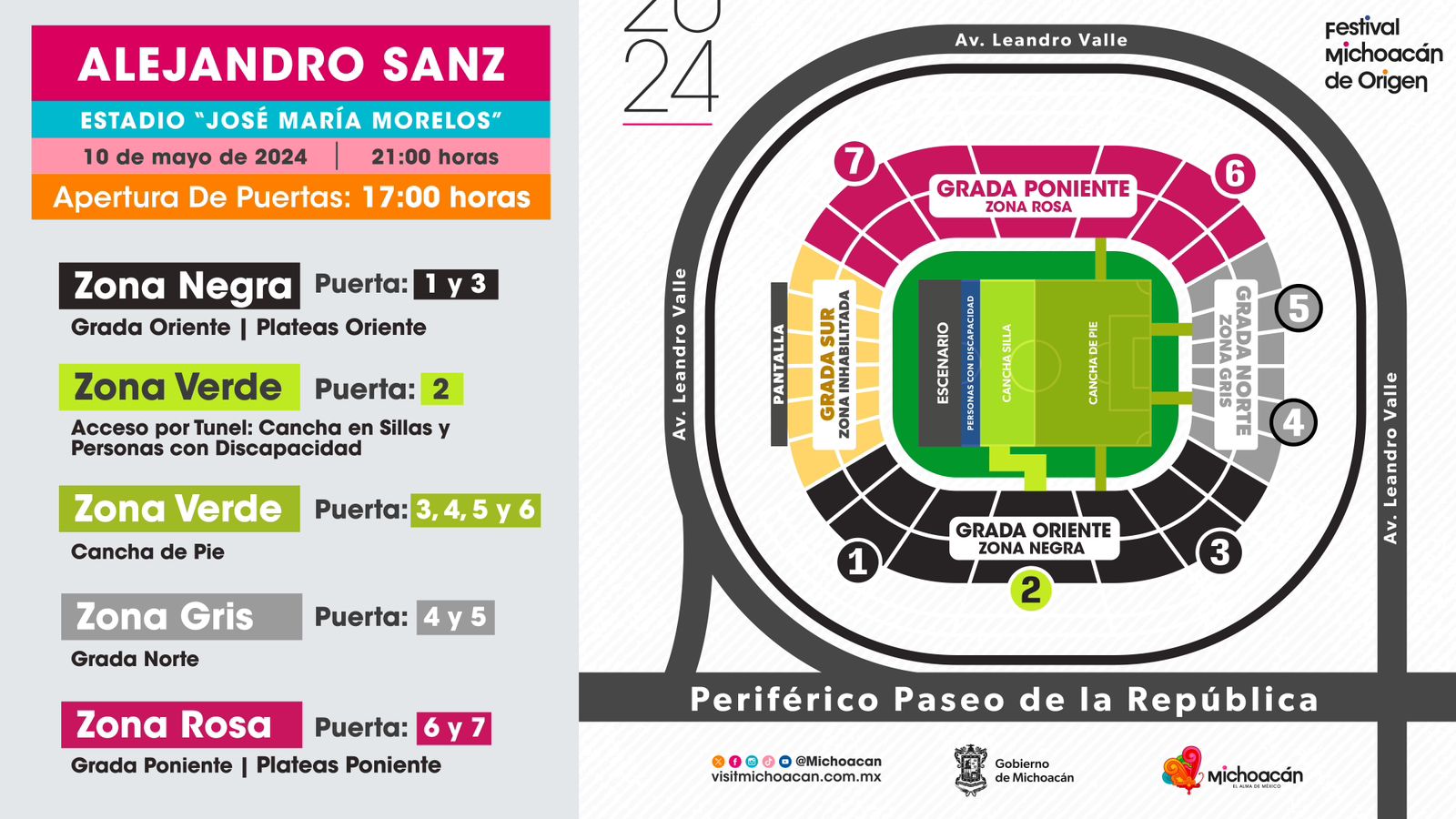 Morelia, Michoacán, 8 de mayo de 2024.- La fecha se acerca para que Alejandro Sanz llegue por primera vez a Michoacán y aquí te contamos cuáles serán los accesos por donde deberás ingresar para ubicar la zona de tu boleto, a partir de las 17:00 horas.