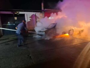 Elementos del Cuerpo de Bomberos Municipales acudieron de inmediato al lugar y trabajaron durante varios minutos para controlar y sofocar las llamas que afectaron por completo el vehículo.