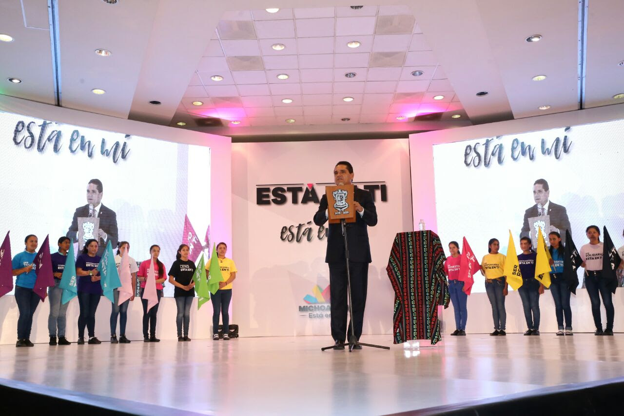 También Karla Yareni Pérez Vega acreedora del premio Nacional de la Juventud promovió el respeto; Audón Punzo Ángel, artista michoacano del Premio Eréndira, la tolerancia y Ramona Gutiérrez Chávez, beneficiaria del programa «Palomas Mensajeras», el compromiso.