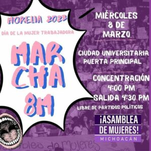 La marcha será el miércoles 8 de marzo de 2023 y saldrá de la puerta principal de CU y terminará en el Palacio de Gobierno, pasando por la calle Cuautla y la avenida Madero. La concentración comenzará a las 4:00 pm y la salida será a las 4:30 pm.