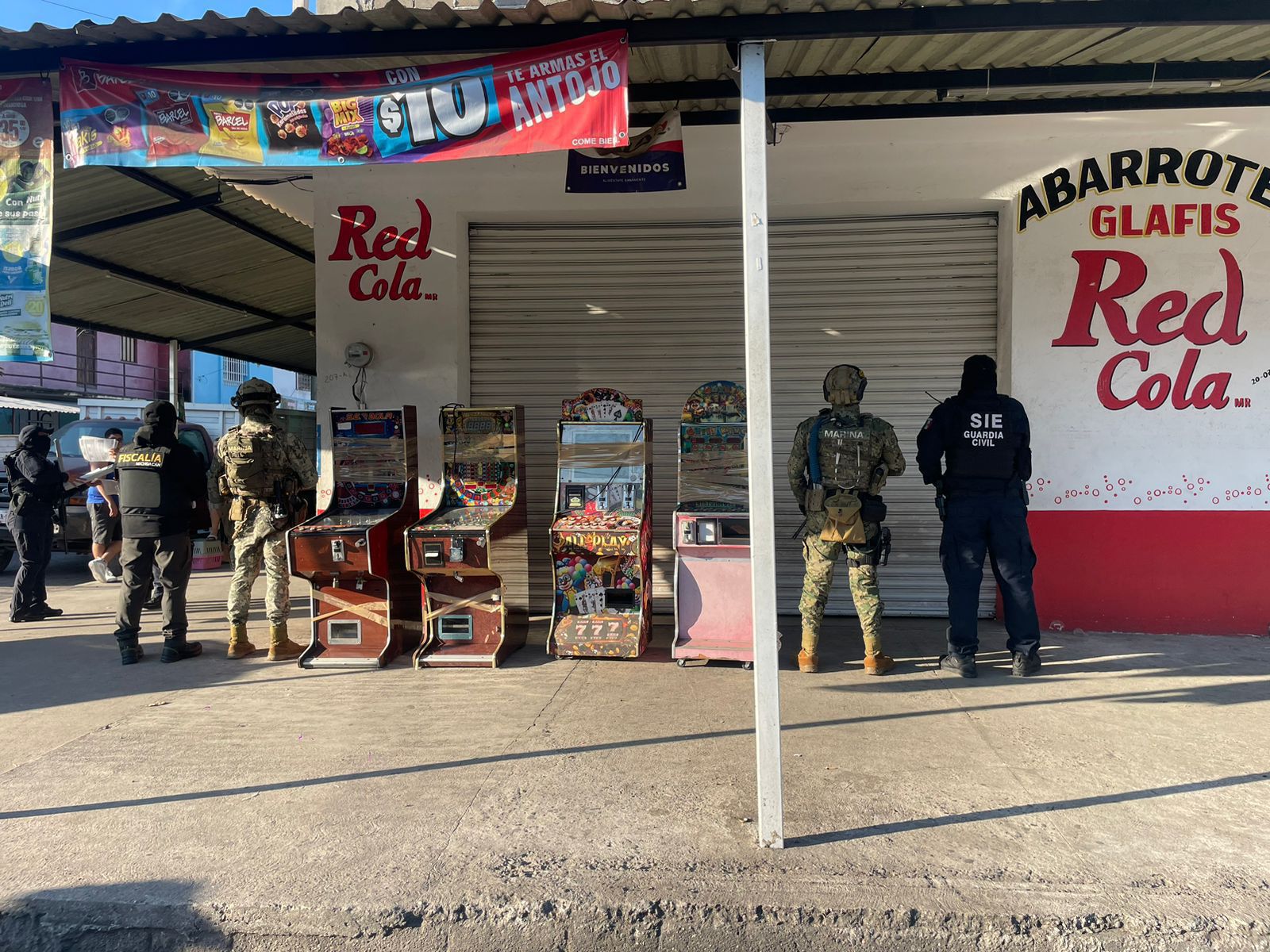 Lázaro Cárdenas, Michoacán, 29 de diciembre de 2025.- En un operativo conjunto, elementos de las secretarías de Seguridad Pública (SSP) y de Marina (Marina), en apoyo a la Fiscalía General del Estado (FGE), aseguraron 183 máquinas tragamonedas en el municipio de Lázaro Cárdenas. La acción derivó de la cumplimentación de 13 órdenes de cateo en diversos inmuebles y una intervención adicional en flagrancia.