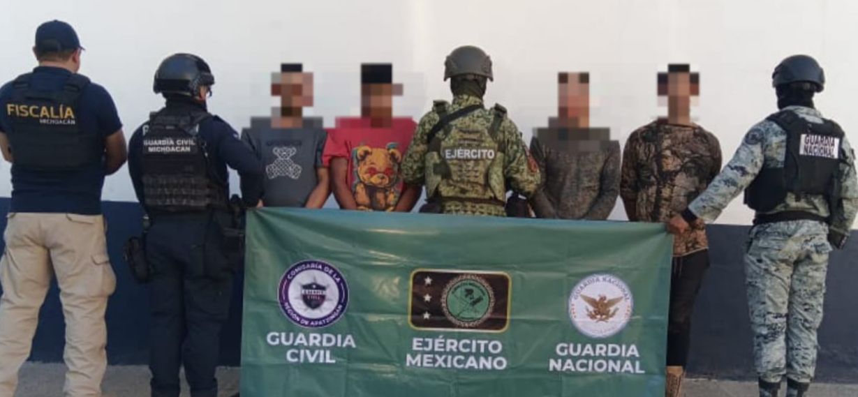 Apatzingán, Michoacán, 28 de marzo del 2025.- Resultado de las labores operativas en la región de Tierra Caliente, cuatro presuntos integrantes de una célula criminal, tres de origen extranjero, fueron detenidos en el municipio de Apatzingán en posesión de armamento, luego de un despliegue interinstitucional de las secretarías de Seguridad Pública (SSP) y de la Defensa Nacional (Defensa), así como de la Fiscalía General del Estado (FGE).