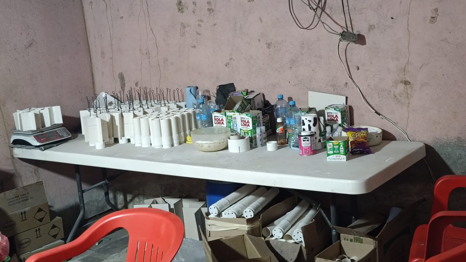 Durante la diligencia, agentes de la Policía de Investigación localizaron una motocicleta marca Italika con reporte de robo vigente del 23 de julio de 2024 en Apatzingán. Asimismo, en el interior del inmueble se hallaron explosivos diseñados para su uso con drones, junto con componentes y materiales almacenados en bolsas y cajas para la fabricación de más dispositivos.