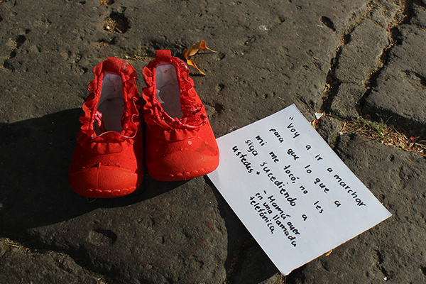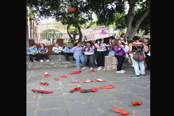 La colocación de un performance con Zapatillas de Rojas, fue de gran impacto visual para quienes se dieron cita en dicho evento. Leyendas y frases de apoyo, dolor, empatía y sacrificio lograron hacer romper en llanto a los espectadores. En memoria y como símbolo de todas aquellas mujeres y niñas que han sido violentadas y que han muerto en esta ola de violencia que se vive en México y el mundo.