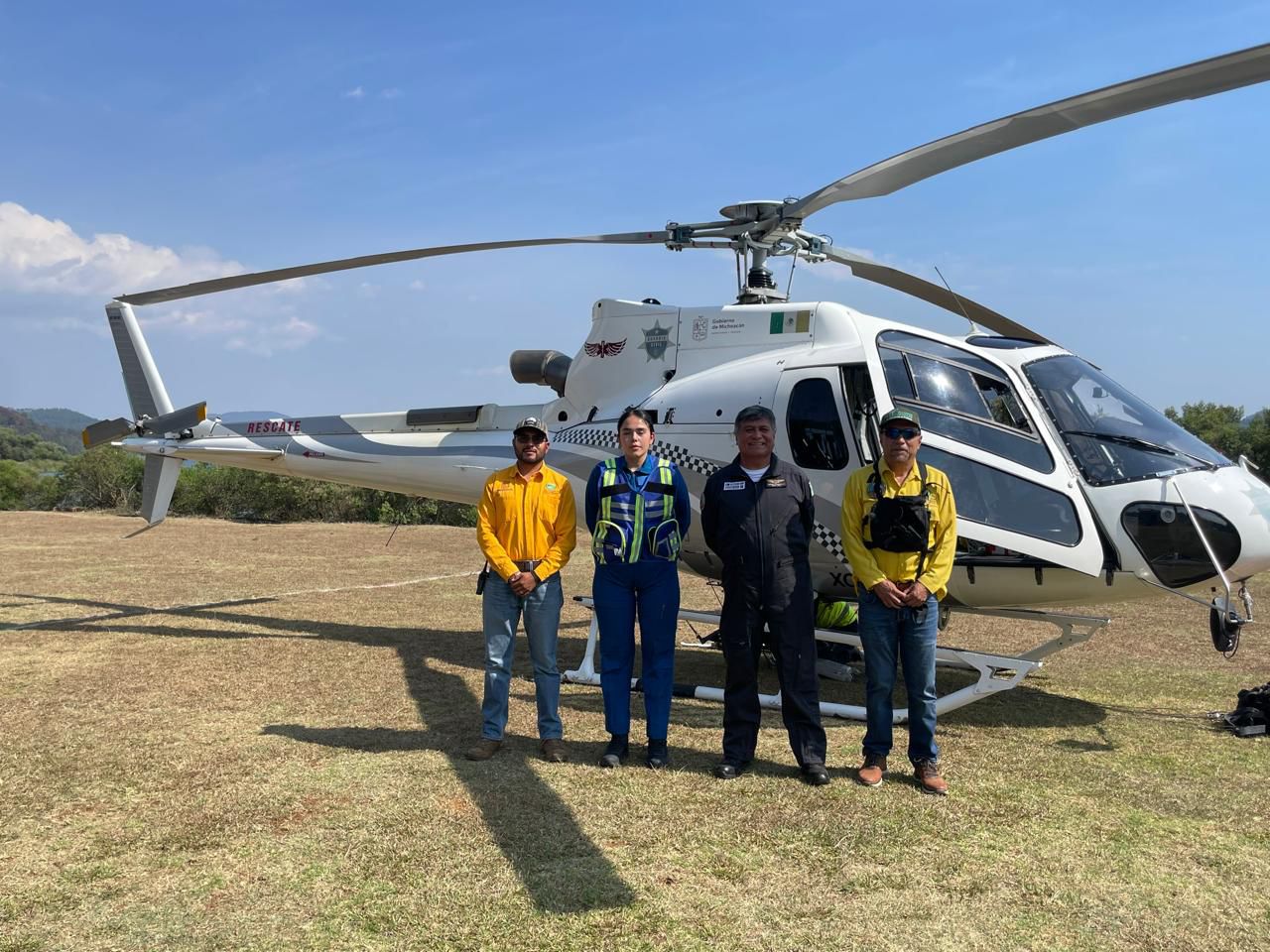 Salvador Escalante, Michoacán, 16 de abril de 2026.- El Gobierno de Michoacán atiende el incendio forestal registrado en la localidad de Jujucato, en el municipio de Salvador Escalante, mediante el despliegue de apoyo aéreo con un helicóptero equipado con helibalde, perteneciente a la Secretaría de Seguridad Pública.