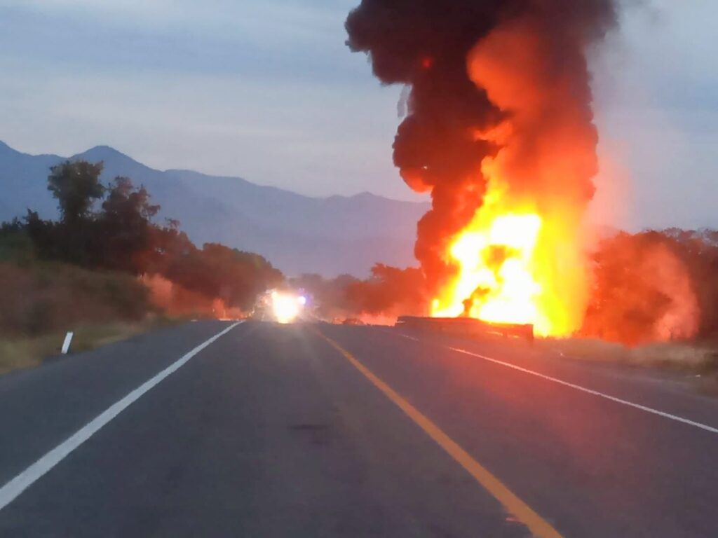 También, agentes de Protección Civil de Apatzingán y Uruapan, así como elementos de la Guardia Nacional y Rescate realizan labores de contención y exterminio del fuego de la pipa de doble remolque con carga de combustible.