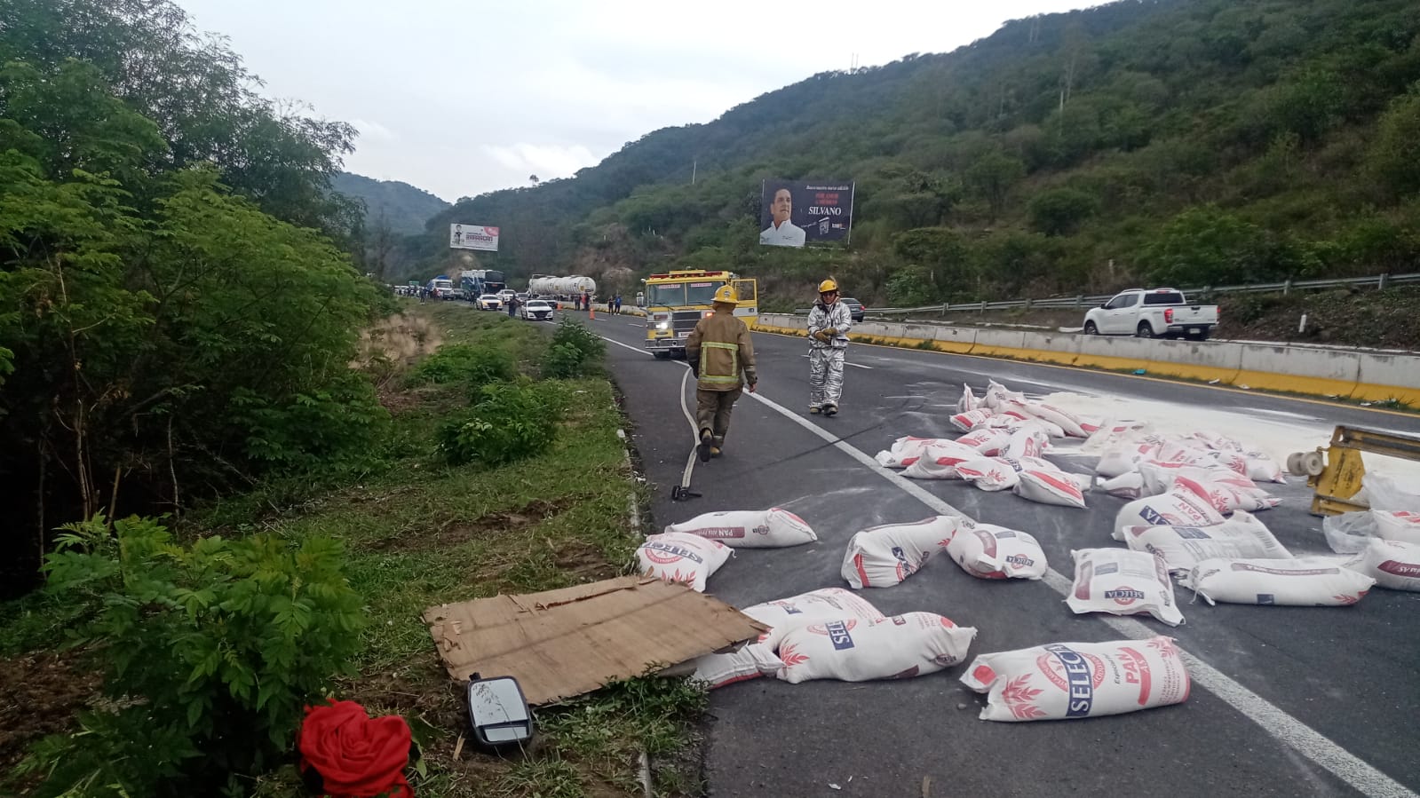 En el lugar un camión del servicio de transporte urbano chocó por alcance a una camioneta de carga que transportaba bultos de harina de trigo que terminaron esparcidos sobre la carpeta asfáltica.