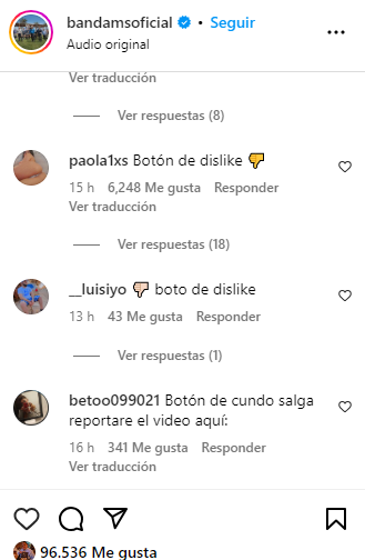 «Botón de no me gusta, Boton de DISLIKE URGENTE, Yo veo puro chicken nugget en este video» se puede ver en algunos comentarios del post de Banda MS