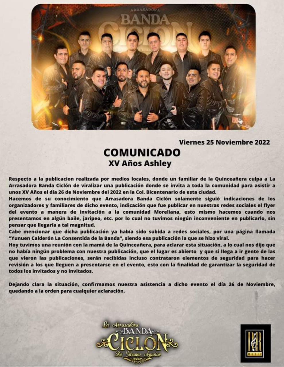 Resulta que en el comunicado menciona que a raíz de algunas publicaciones de medios locales, donde un familiar de la quinceañera dice que la banda es la culpable de que se viralizará la invitación para toda la ciudad de Morelia.