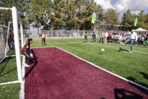 En tanto, el secretario de Comunicaciones y Obras Públicas, Rogelio Zarazúa Sánchez, expuso que se realizaron trabajos de mejoramiento de terreno para la construcción de la cancha, se instaló pasto sintético, luminarias solares y gradas para que las familias puedan acudir a dichos espacios.