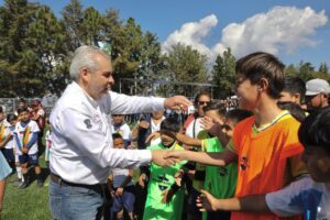 Explicó que el Gobierno estatal construye 41 canchas en 40 municipios, a fin de avanzar en el rescate de espacios públicos para que las niñas, niños y jóvenes puedan llevar a cabo actividades deportivas.
