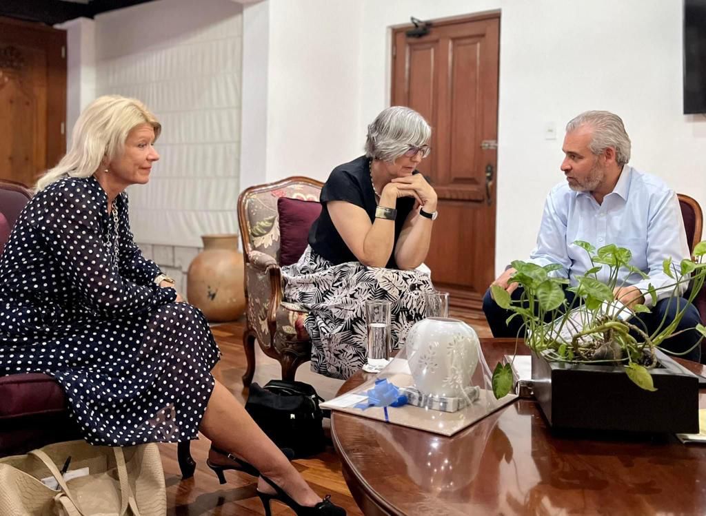 Morelia, Michoacán, 29 de julio de 2023.- El gobernador Alfredo Ramírez Bedolla se reunió con las embajadoras de Finlandia y de Austria en México, Päivi Pohjanheimo y Elisabeth Kehrer, respectivamente, para fortalecer la atracción de inversiones en Michoacán.