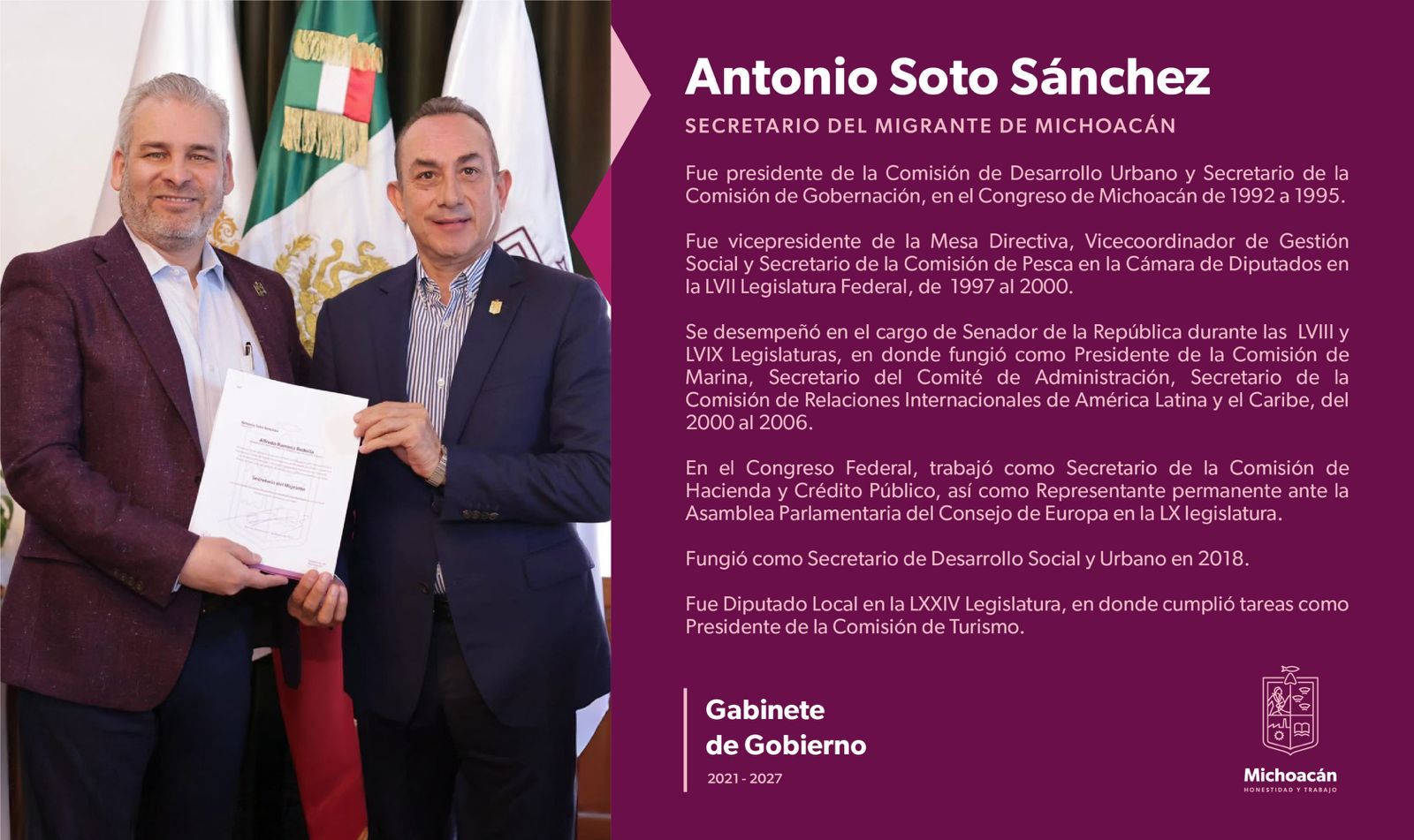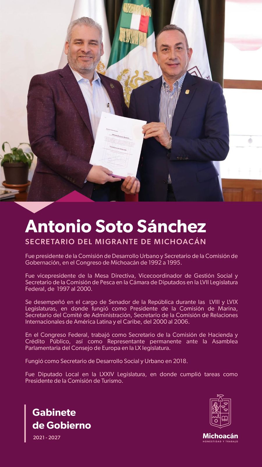Morelia, Michoacán, 1 de febrero de 2025.- El gobernador Alfredo Ramírez Bedolla designó a Antonio Soto Sánchez como nuevo secretario del Migrante en sustitución de Andrea López Contreras.