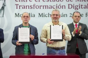 Morelia, Michoacán, 26 de febrero de 2026.– A fin de agilizar y simplificar los trámites que realiza la población ante el Gobierno de Michoacán y el Gobierno Federal, el gobernador Alfredo Ramírez Bedolla firmó un convenio de colaboración con José Antonio Peña Merino, titular de la Agencia de Transformación Digital y Telecomunicaciones.