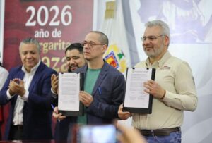 Morelia, Michoacán, 26 de febrero de 2026.– A fin de agilizar y simplificar los trámites que realiza la población ante el Gobierno de Michoacán y el Gobierno Federal, el gobernador Alfredo Ramírez Bedolla firmó un convenio de colaboración con José Antonio Peña Merino, titular de la Agencia de Transformación Digital y Telecomunicaciones.