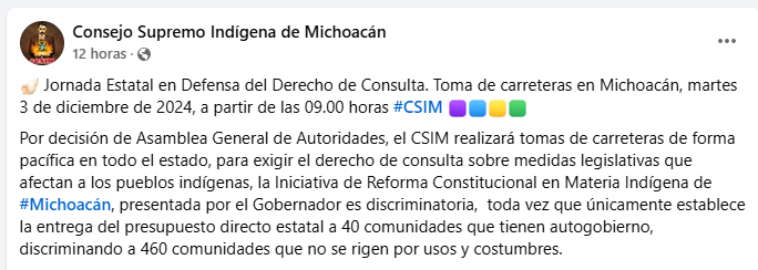 Morelia, Michoacán, 2 de diciembre de 2024 – Este martes, el Consejo Supremo Indígena de Michoacán (CSIM) llevará a cabo bloqueos en diversos puntos carreteros de la entidad, incluyendo el Ramal Camelinas en Morelia, en protesta contra la iniciativa de Reforma Constitucional en Materia Indígena presentada por el gobernador Alfredo Ramírez Bedolla.