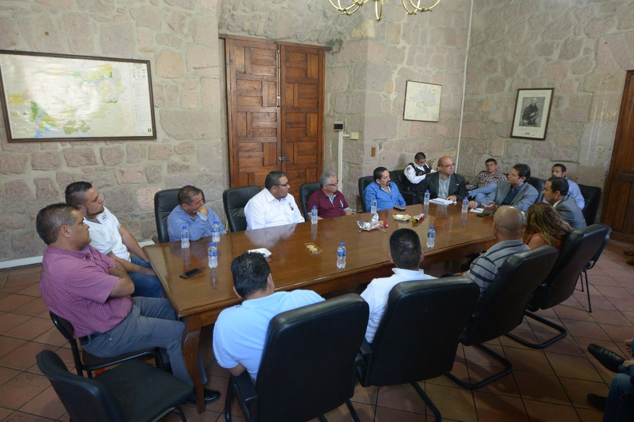 Morelia, Mich. a 4 de abril del 2018.- El Alcalde Martínez Alcázar en compañía del Secretario del Ayuntamiento, Jesús Ávalos Plata, y el Secretario de Desarrollo Metropolitano e Infraestructura, Juan Fernando Sosa Tapia, se reunió con transportistas de diferentes organizaciones para entablar un diálogo respecto al uso de paradas establecidas, el respeto del reglamento de tránsito, la actividad de los jueces cívicos y el trabajo de la Policía de Morelia.