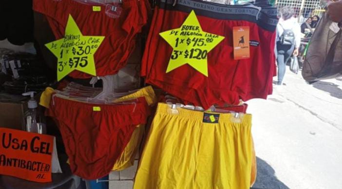 Donde existen varios tipos de prendas intimas en diversos colores, formas y tamaños, pero en estas fechas los mas comunes son los rojos que sirven para el amor, los amarillos para el dinero y blanco para la buena salud.