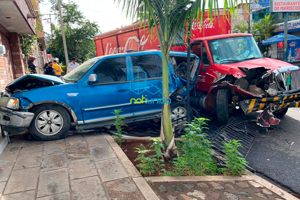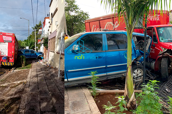 Se informó que el camión de la empresa ‘Coca Cola’ circulaba sobre de oriente a poniente, y en una pendiente sufrió una falla en el sistema de frenos e impacto a la camioneta color azul.
