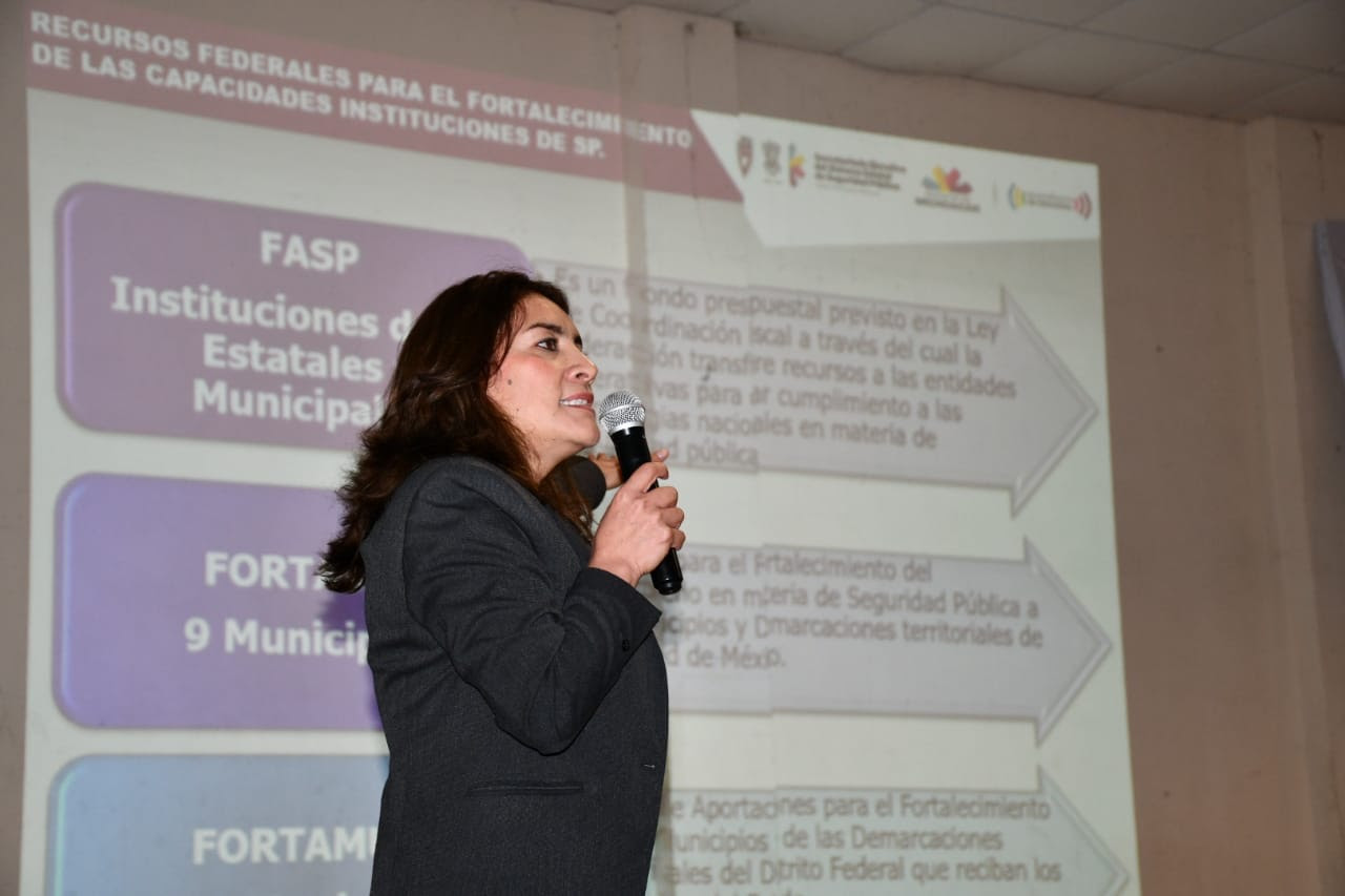 La funcionaria estatal detalló a los síndicos -a través de una proyección-, lo que es el Subsidio para el Fortalecimiento del Desempeño en Materia de Seguridad Pública (FORTASEG), el Fondo de Aportaciones para el Fortalecimiento de los Municipios y las Demarcaciones Territoriales del Distrito Federal (FORTAMUN), reglas de operación, el Estado de Fuerza Municipal, la certificación de los elementos policiacos y los pasos que deben seguir para obtener el Certificado Único Policial (CUP).