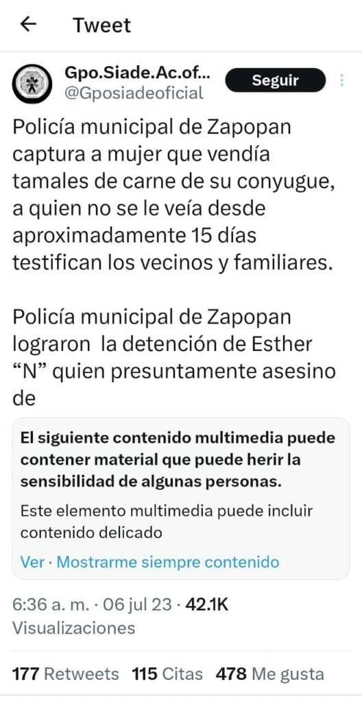 A 06 de julio del 2023.- En la ciudad de Zapopan, Jalisco la policía municipal arresto a una mujer mientras cocía tamales de carne humana.