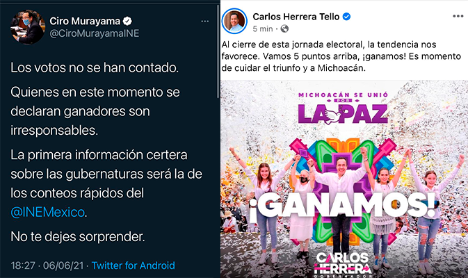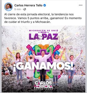 «Al cierre de esta jornada, la tendencia nos favorece. Vamos 5 puntos arriba, ¡Ganamos! Es momento de cuidar el triunfo y a Michoacán», publicó Herrera acompañado de una imagen con la frase «ganamos»