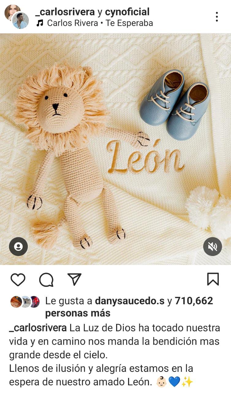 «La luz de dios ha tocado nuestra vida y en camino nos manda la bendición mas grande desde el cielo, llenos de ilusión y alegría estamos en la espera de nuestro amado león» se puede leer en la descripción del Instagram de Carlos