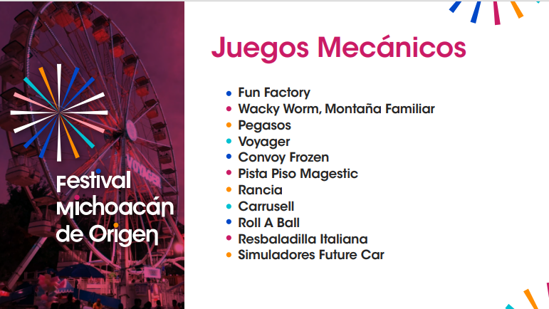 Morelia, Michoacán, 02 de mayo de 2022.- Conciertos, juegos mecánicos para niños y grandes, gastronomía, artesanías, expo de productos michoacanos, zona comercial, actividades culturales, entre otros atractivos, tendrá el Festival Michoacán de Origen, que se llevará a cabo del 5 al 22 de mayo en el Centro de Exposiciones y Convenciones de Morelia.