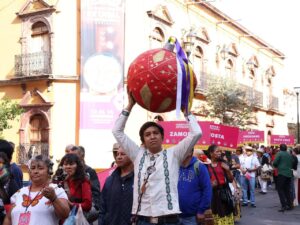 Acompañados por el ritmo de la banda de música, creadoras y creadores provenientes de localidades como Pamatácuaro, Tzintzuntzan, Capula, Nocutzepo, Uruapan, Cheranástico, Nahuatzen, Cherán, Zacán, Cocucho, Patamban, Boca de la Cañada, entre otras, mostraron con orgullo la riqueza cultural de sus comunidades y cautivaron al público con su vestimenta tradicional y expresiones artísticas.