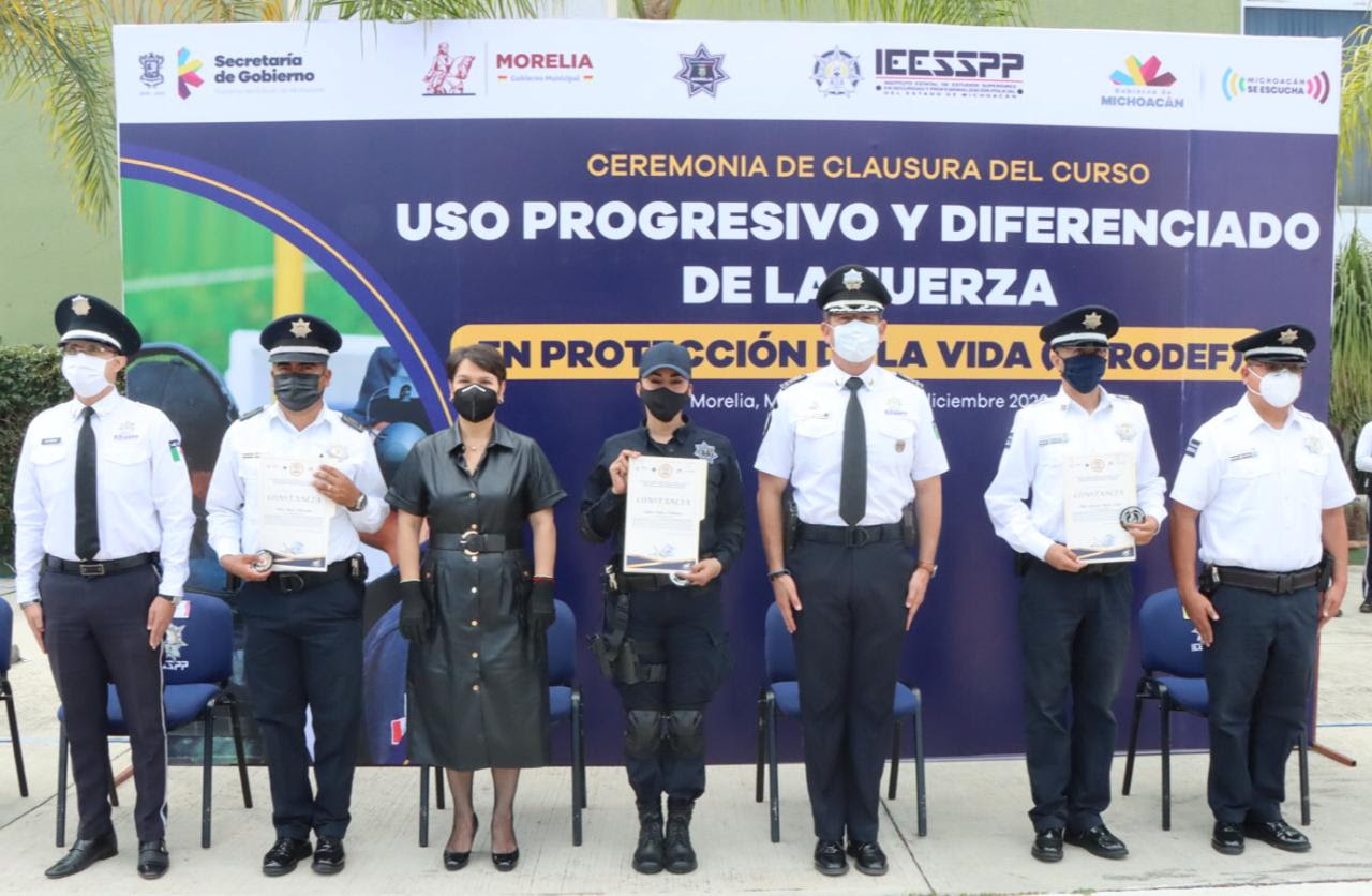 Morelia, Michoacán, a 4 de diciembre de 2020.- El Instituto Estatal de Estudios Superiores en Seguridad y Profesionalización Policial del Estado de Michoacán (IEESSPP), clausuró los trabajos del Curso Método de Entrenamiento del Uso Progresivo y Diferenciado de la Fuerza en Protección de la Vida (UPRODEF), para la Policía Morelia.