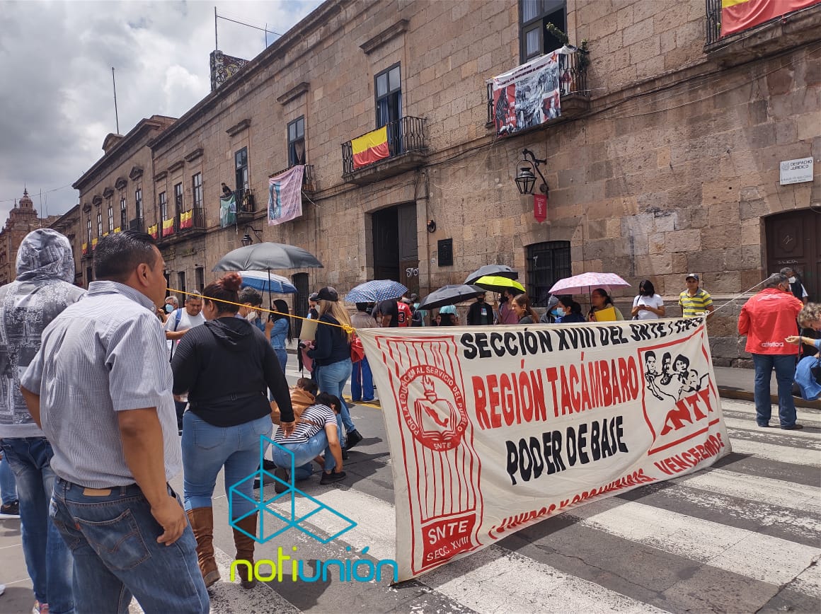 Morelia, Michoacán a 15 de junio del 2022.- La mañana de este miércoles integrantes de la Coordinadora Nacional de Trabajadores de la Educación (CNTE) Sección XVIII Poder de Base, dirigidos por Benjamín Hernández Gutiérrez decidieron expandir el plantón que mantienen sobre la avenida Francisco I. Madero frente a Palacio de Gobierno, hasta la plaza de San Francisco, lugar donde ya bloquearon calles aledañas.