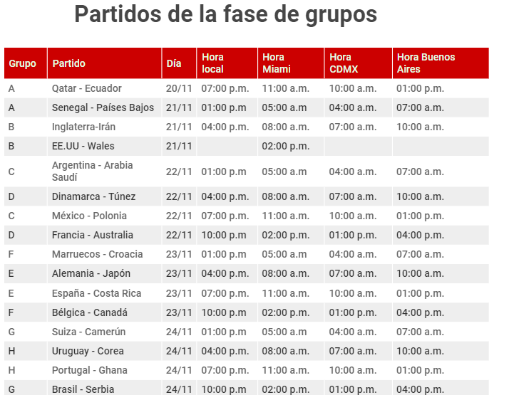 Aquí te dejamos donde puedes visualizar los partidos de la fase de grupos, que tendrá lugar entre el 20 de noviembre y el 2 de diciembre. En total se jugarán en esa fase 48 partidos.