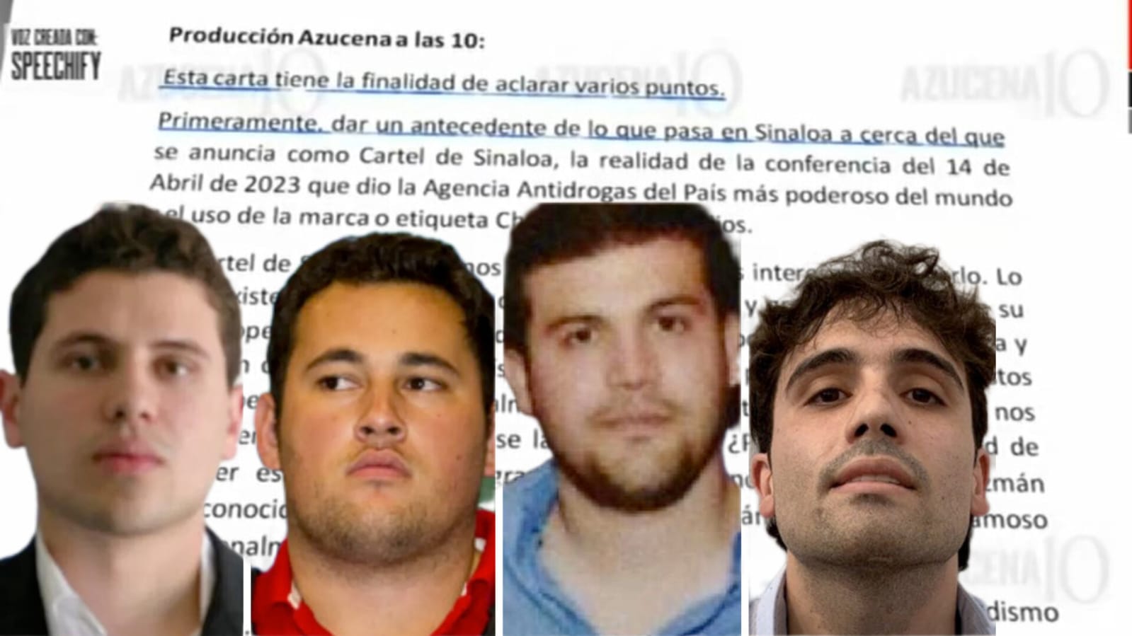 A 04 de mayo del 2023.- Una noticia circula por redes sociales donde el día de ayer en el noticiero de «Azucena a las 10» los hijos del conocido narcotraficante Joaquín Guzmán Loera por medio de su abogado mandaron un comunicado donde expresan situaciones de narcotráfico, corridos y redes sociales.
