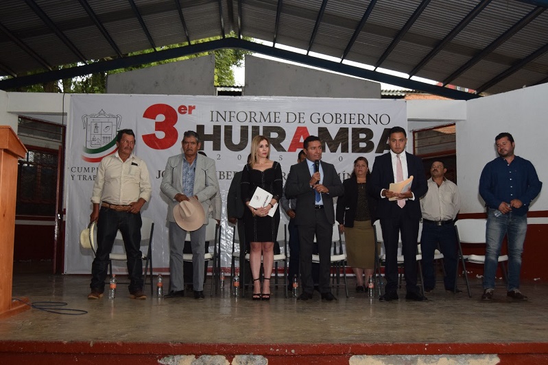 Huiramba, Michoacán, a 1 de agosto de 2018.- En representación del Gobernador del Estado, Silvano Aureoles Conejo, la directora general del Instituto de Vivienda del Estado de Michoacán (IVEM), María Yesmin Sánchez Huerta, asistió al Tercer Informe del presidente municipal de Huiramba, José Humberto García Domínguez.