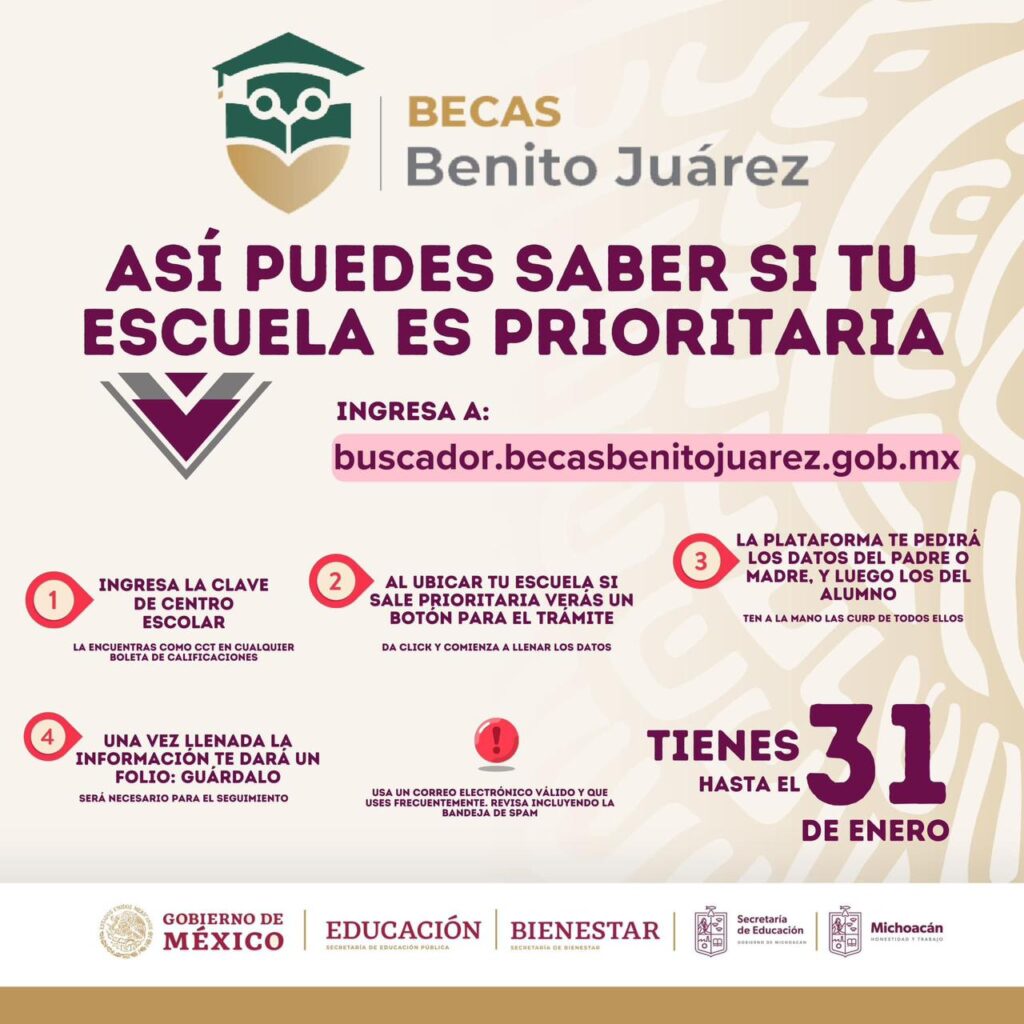 La convocatoria para solicitar la Beca Bienestar cierra el miércoles de esta semana; para inscribirse es necesario saber si la escuela donde estudia el niño o la niña está dentro de las prioritarias, a través del buscador https://buscador.becasbenitojuarez.gob.mx/escuelas/.