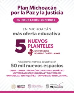 Actualmente, cerca de 138 mil estudiantes cursan educación superior en Michoacán; con esta estrategia, se abrirán 50 mil nuevos espacios en coordinación con instituciones como la UNAM, UMSNH, Tecnológico Nacional de México, universidades tecnológicas, politécnicas, Benito Juárez e Intercultural.