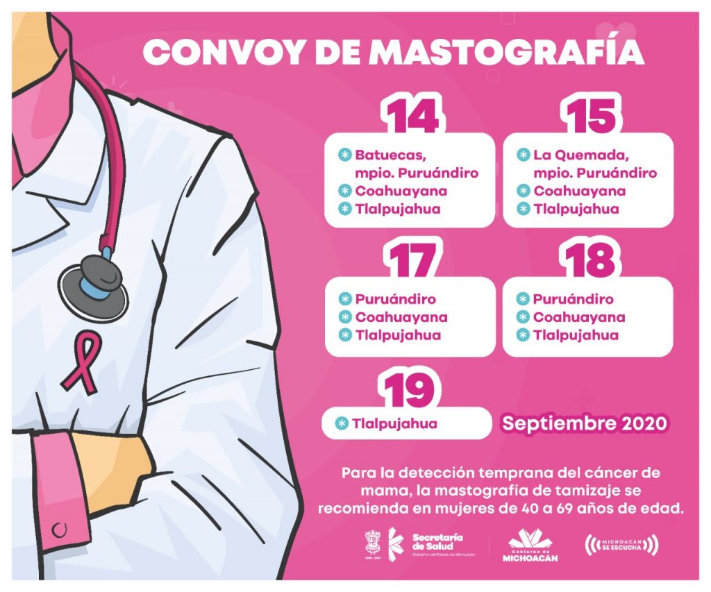 Morelia, Michoacán, a 12 de septiembre de 2020.- Como parte de las acciones para la detección temprana del cáncer de mama, los mastógrafos móviles de la Secretaría de Salud de Michoacán (SSM), estarán en los municipios de Puruándiro, Coahuayana y Tlalpujahua.