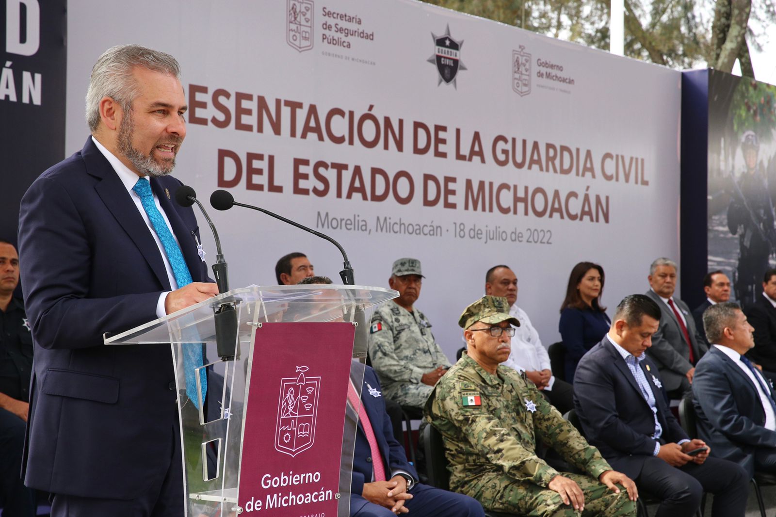 Morelia, Michoacán, 18 de julio del 2022.– El gobernador Alfredo Ramírez Bedolla encabezó la presentación de la Guardia Civil de Michoacán, con lo que inicia la transformación y reorganización estratégica de las políticas de seguridad pública en la entidad.